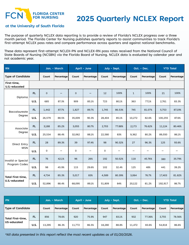 The purpose of quarterly NCLEX data reporting is to provide a review of Florida’s NCLEX progress over a three month period. The Florida Center for Nursing publishes quarterly reports to assist communities to track Florida’s first-attempt NCLEX pass rates and compare performance across quarters and against national benchmarks.